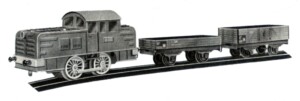 | Notizen | Batteriebahn-GüterzugKomplett im Karton verpackt, bestehend aus Diesellokomotive, 2 Güterwagen und 8 gebogenen Gleisen Ohne Abbildung:Nr. 105/631 — Batteriebahn-Güterzug Wie Nr. 105/630, jedoch mit E-Lokomotive |