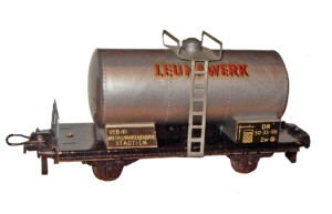 | Notizen | 2 Achsen, LüP 14 cm , Bremserplattform, Beschriftungsvariante: Kessel grau - mit Beschriftung "Leunawerk" |