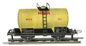 Notizen2 Achsen, LüP 12,5 cm, Kessel aus Kunststoff, Wahrweg aus Blech, Beschriftungsvariante: Kessel gelb - mit Beschriftung „Minol"