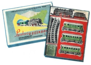 | Notizen | Inhalt: 1 Dampflok mit Tender, 2 Personenwagen 108/708, 1 Packwagen 12 gebogene Schienen inkl. Anschlußgleis, 4 gerade Schienen Batteriekasten, Zuglänge 76 cm |